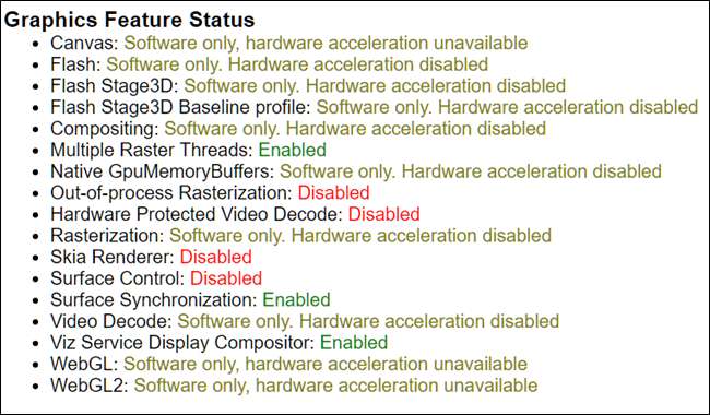 en el Omnibox y presione Enter. Cuando se deshabilita la aceleración de hardware, la mayoría de los elementos en "Estado de la función de gráficos" leerán "Solo software, aceleración de hardware deshabilitada".