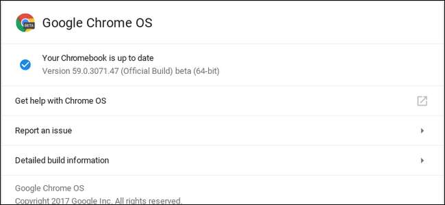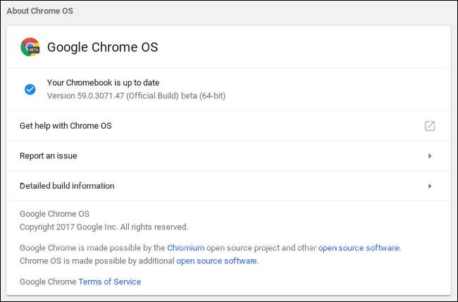 Ahora, debería poder ir a Configuración> Acerca de Chrome OS> Buscar actualizaciones y obtener la última versión.