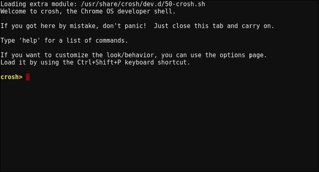 Primero, presione Ctrl + Alt + T en su Chromebook para abrir el terminal crosh. Es una pantalla negra simple, ligeramente desalentadora, con un texto mínimo y un cursor esperando su entrada. No se asuste, esto va a ser simple.