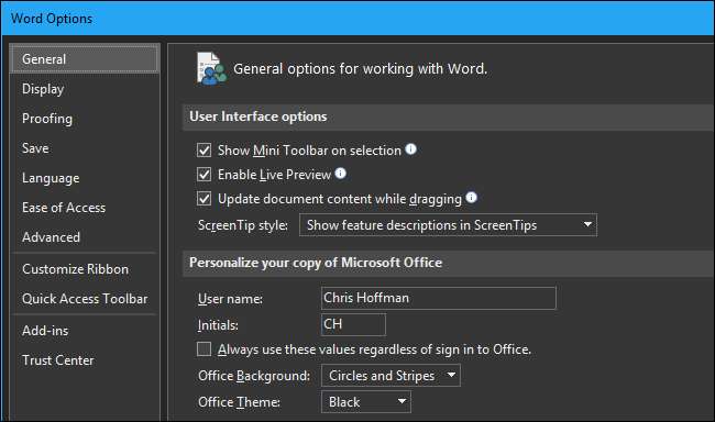 A elige el tema oscuro , abra una aplicación de Office como Word o Excel y diríjase a Archivo> Opciones. En la pestaña "General", busque el clic en la sección "Personalizar su copia de Microsoft Office" y configure el menú desplegable "Tema de Office" en la opción "Negro".