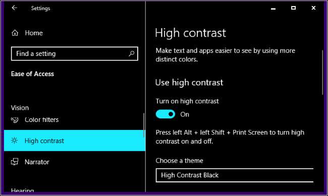 Windows tiene un tema oscuro incorporado para aplicaciones de escritorio, pero probablemente no sea ideal. Para habilitarlo, diríjase a Configuración> Facilidad de acceso> Alto contraste. A la derecha, habilite la opción "Activar alto contraste" y configure el menú desplegable "Elegir un tema" en la configuración "Negro de alto contraste". Haga clic en "Aplicar" para guardar la configuración.