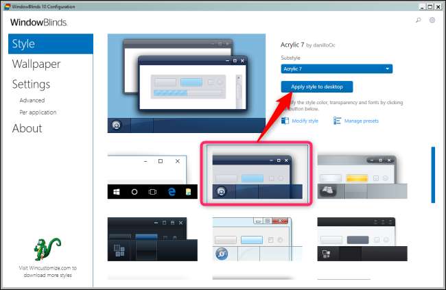 Después de instalarlo, enciéndalo y diríjase a la pestaña "Estilo". Para aplicar un tema, simplemente seleccione el que desee y luego haga clic en el botón "Aplicar estilo al escritorio".