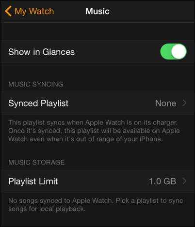 Seleccione "Música" y luego, dentro del submenú de música, haga ajustes a su límite de almacenamiento de música, si es necesario (puede ajustarlo desde 1.0GB de almacenamiento hasta 2.0GB de almacenamiento). Aquí también es donde configura la lista de reproducción. Toca la entrada "Lista de reproducción sincronizada". Mostrará todas las listas de reproducción en tu iPhone. Seleccione el que desea sincronizar con el Apple Watch.
