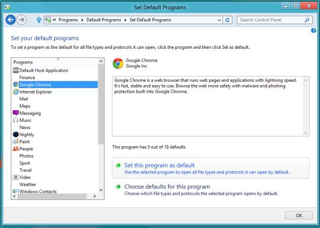 Busque Google Chrome en la lista y haga clic en la opción Establecer este programa como predeterminado. Para volver a habilitar Internet Explorer como su navegador Metro predeterminado, seleccione Internet Explorer en esta ventana y configúrelo como su navegador predeterminado.