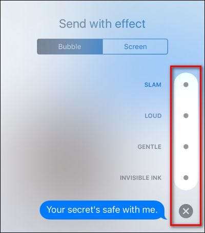 Los efectos son, como se enumeran anteriormente: "Slam", "Loud", "Gentle" y "Invisible Ink". Puede tocar el círculo pequeño junto a cualquiera de esos elementos para obtener una vista previa instantánea de cómo se verá su destinatario. No te preocupes, el mensaje no se enviará hasta que confirmes presionando el ícono azul de enviar para confirmar. ¿No quieres el efecto? Toque la "X".