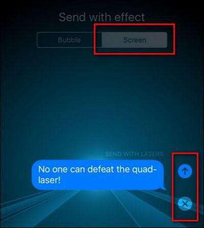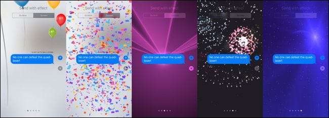 A diferencia de los efectos de burbujas (que varían entre efectos automáticos como Slam y efectos interactivos como Invisible Ink), todos los efectos de pantalla se activan automáticamente. El destinatario verá lo mismo (estrellas fugaces, fuegos artificiales, lo que elija) cuando reciba (o abra) el mensaje. Lamentablemente, es un trato de una sola vez: no importa cuánto le gusten los láseres, no puede volver a tocar el mensaje, ni nada parecido, y ver la animación que se envió originalmente con la repetición del mensaje.