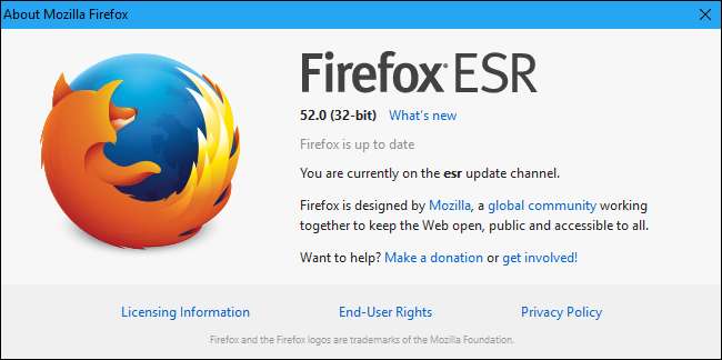 Puede verificar que está utilizando la versión ESR de Firefox haciendo clic en menú> Ayuda> Acerca de Firefox. Verá "Firefox ESR" aquí si está en el canal de actualización de ESR.