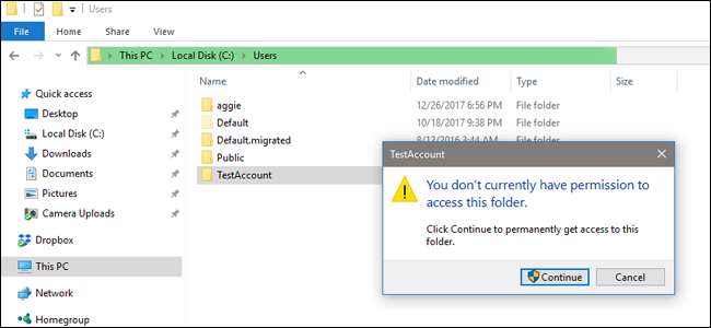 Bloquee la cuenta secundaria de Windows y vuelva a su cuenta principal de Windows. Ahora, abra el programa Explorador de Windows y navegue hasta la carpeta Usuarios; de forma predeterminada, es C: \ Users. Haga doble clic en la carpeta para el nuevo usuario de Windows que acaba de crear, luego haga clic en "Continuar" para acceder a sus archivos con sus privilegios de administrador.