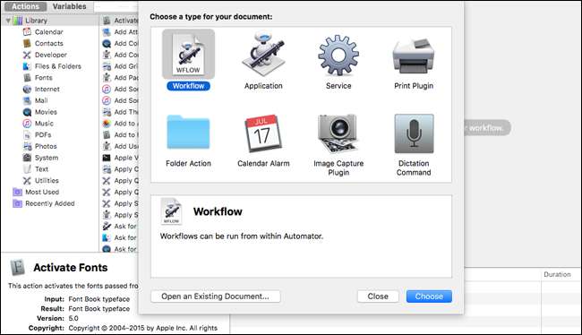 Abra el programa Automator (utilice el icono de búsqueda de Spotlight en la esquina superior derecha si no puede encontrarlo) y haga clic en "Flujo de trabajo", luego en "Seleccionar".