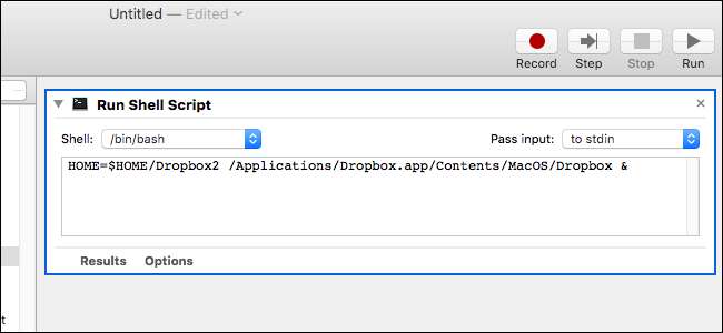 Haga clic dentro del cuadro de texto del script de shell y elimine "cat". Luego reemplácelo con el siguiente guión; puede copiar y pegar desde esta página. Tenga en cuenta que "Dropbox2", a continuación, es el nombre de la carpeta que creó en Inicio en el paso anterior. Si usó otro nombre, modifique el script en consecuencia.