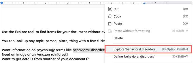 Finalmente, puede abrir explorar e ir directamente a su tema. Seleccione el texto en su documento que desea buscar. Luego, haga clic con el botón derecho y elija "Explore [Texto seleccionado]".