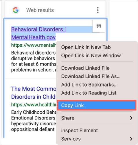 También puede agregar uno de los enlaces que ve en los resultados de la web a su documento. Haga clic con el botón derecho en el enlace, seleccione "Copiar enlace" o "Copiar", y luego péguelo en su documento donde lo desea.