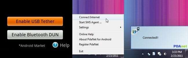 Nota: Aunque usamos un dispositivo Android y una máquina con Windows para este tutorial, PdaNet está disponible para una amplia gama de dispositivos. Puede obtener el componente móvil de PdaNet para teléfonos Android, iPhone, BlackBerry, teléfonos con Windows Mobile e incluso Palm OS. El componente de escritorio está disponible para Windows y Mac OS X. Los siguientes pasos de configuración deberían traducirse fácilmente en las diversas combinaciones de componentes de escritorio y móviles.