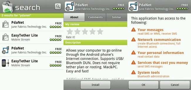 En primer lugar, busque PdaNet en Android Market (si tiene curiosidad por saber por qué hay copias duplicadas de los resultados de búsqueda en nuestra búsqueda de Market, es un misterio que es mejor dejar a los ingenieros de Google). En caso de que haya aplicaciones futuras con un nombre similar, asegúrese de instalar la de June Fabrics Technology Inc.