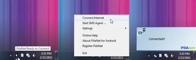 Debería conectarse automáticamente cuando conecte su teléfono (con el anclaje USB habilitado) a su computadora. Si no es así, haga clic derecho en el icono y seleccione Conecta Internet . ¡Éxito!