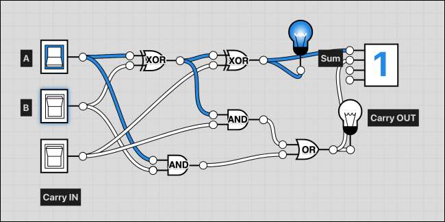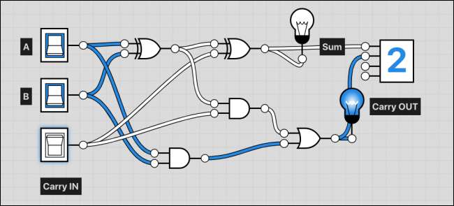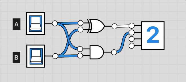 Con solo dos puertas puede hacer una suma binaria básica. Este diagrama de arriba muestra un medio sumador, creado usando Lógicamente , un patio de juegos en línea gratuito para puertas lógicas. La puerta XOR aquí se encenderá si solo una de las entradas está encendida, pero no ambas. La puerta AND se encenderá si ambas entradas están encendidas, pero permanecerá apagada si no hay ninguna entrada. Entonces, si ambos están encendidos, el XOR permanece apagado y la puerta AND se enciende, llegando a la respuesta correcta de dos: