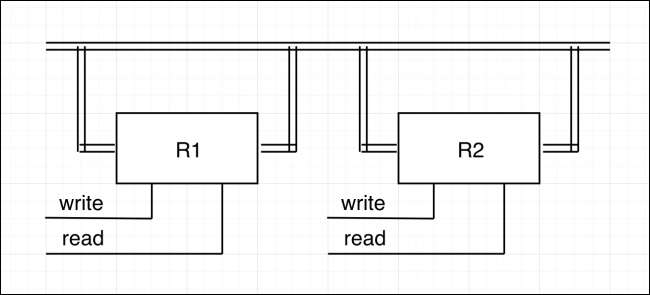 Cada registro todavía tiene un bit de lectura y escritura, pero en esta configuración, la entrada y la salida son lo mismo. Esto es realmente bueno. Por ejemplo. Si quisiera copiar el contenido de R1 en R2, activaría el bit de lectura para R1, lo que empujaría el contenido de R1 al bus. Mientras el bit de lectura está activado, activaría el bit de escritura para R2, que copiaría el contenido del bus en R2.