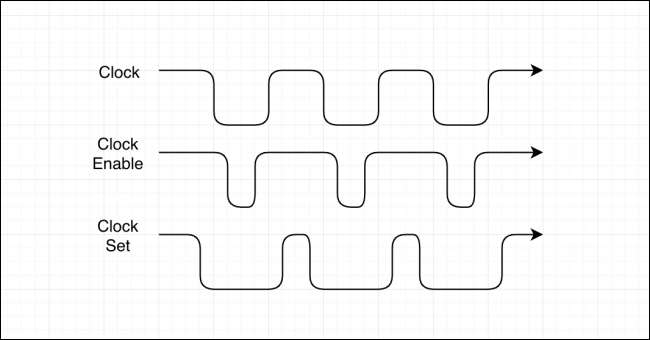 El reloj tiene tres estados diferentes: el reloj base, el reloj habilitado y el reloj configurado. El reloj base estará encendido durante medio ciclo y apagado durante la otra mitad. El reloj de activación se utiliza para activar los registros y deberá estar activado durante más tiempo para asegurarse de que los datos estén activados. El reloj configurado siempre debe estar encendido al mismo tiempo que el reloj de habilitación, o de lo contrario se podrían escribir datos incorrectos.