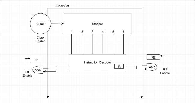 El reloj está conectado al paso a paso, que contará desde uno hasta el paso máximo y se reiniciará a uno cuando haya terminado. El reloj también está conectado a puertas AND para cada registro en el que la CPU puede escribir:
