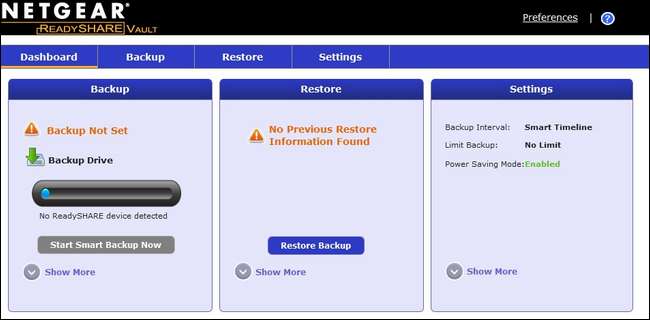 La segunda aplicación, vista arriba, se empareja con ReadyShare Vault en su enrutador para una copia de seguridad y restauración de archivos locales automatizados. Nuevamente, no necesita esa aplicación para usar la función de uso compartido de red (y puede usar sus propias aplicaciones o herramientas del sistema operativo para hacer una copia de seguridad en el recurso compartido de red) pero es una buena inclusión que está ahí si lo desea.
