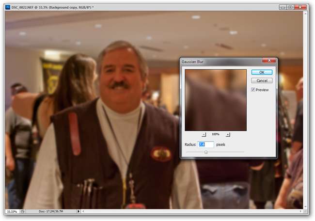 Luego navega a Filtro> Desenfocar> Desenfoque gaussiano con esa capa duplicada seleccionada. En nuestro ejemplo, usamos una configuración de 7,4 píxeles, aunque tendrás que jugar con la configuración y descubrir qué funciona para tu imagen. Demasiado parecerá muy falso. Demasiado poco no hará lo suficiente para cambiar la imagen. La cantidad adecuada de desenfoque suavizará el fondo, hará que el primer plano resalte más y evitará que la imagen parezca demasiado retocada. O "Gimped", si usa software gratuito.