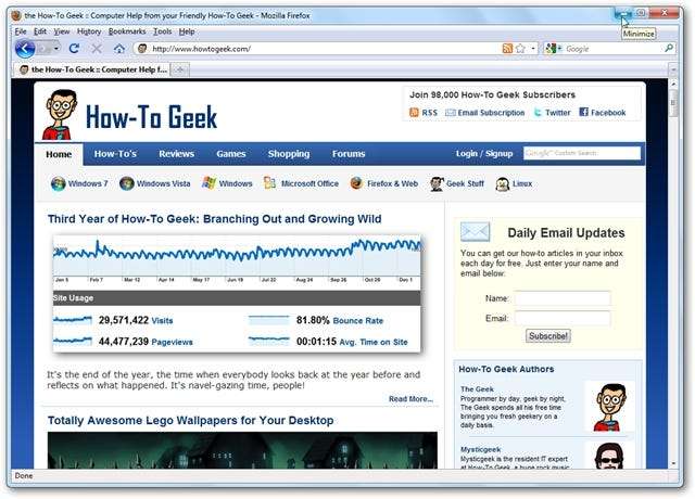Para hacer una ventana de aplicación 3D, haga clic con el botón derecho en el botón Minimizar. Aquí mostramos Firefox abierto en su aspecto 2D normal.