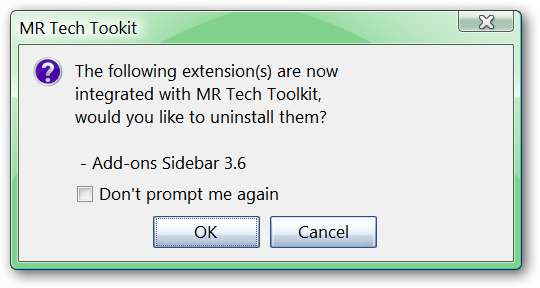 Hay una cosa a tener en cuenta al instalar la extensión de la barra lateral de complementos. Si ya tiene instalada la extensión MR Tech Toolkit, verá la siguiente ventana de mensaje. Haga clic en "Cancelar" para completar la instalación ... de lo contrario, se desinstalará la barra lateral de complementos.