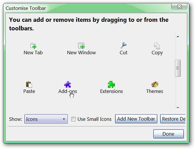No hay opciones de las que deba preocuparse ... simplemente agregue el botón de la barra de herramientas (si lo desea). Para agregar el botón de la barra de herramientas, haga "clic derecho" en una de las barras de herramientas y seleccione "Personalizar ..." para abrir la ventana "Personalizar la barra de herramientas". Agarre el "Botón de complementos" con el mouse, muévalo a la ubicación que elija y cierre la "Ventana de barra de herramientas personalizada".