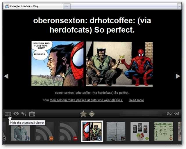 Google Reader Play es un nuevo juguete genial de Google Labs que reproducirá una presentación de diapositivas de artículos web. Realizará un seguimiento de sus elementos recomendados de Google Reader y encontrará intereses similares de lo que usted y otras personas a las que sigue han compartido.