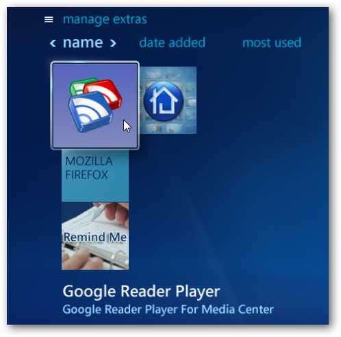 Una vez completada la instalación, abra WMC y seleccione Extras Library en el menú principal. Luego haga clic en el ícono de Google Reader Player.