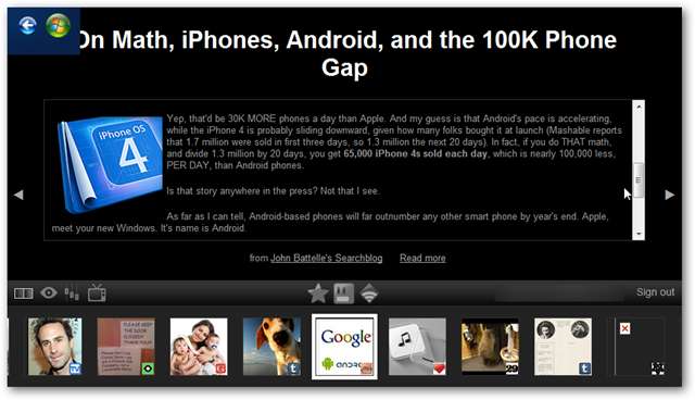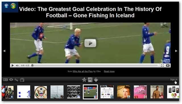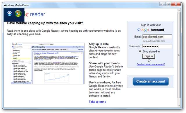 Ahora puedes ver Google Reader Play como lo harías en un navegador, pero ahora está en WMC ... genial. Deberá iniciar sesión para ver el contenido que le interesa. Haga clic en el enlace Iniciar sesión en la esquina inferior derecha de la pantalla.