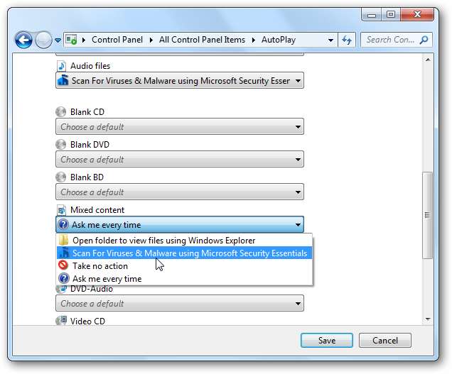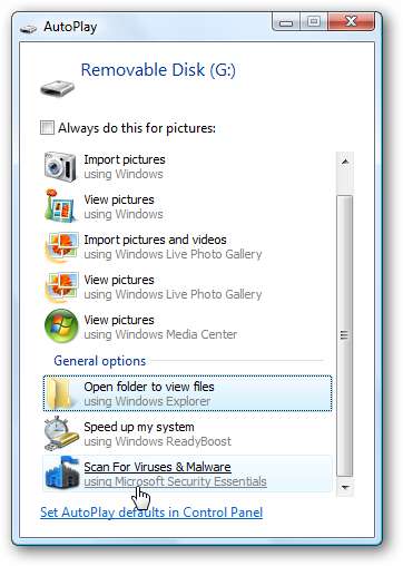 Ahora, cuando ingrese una memoria USB, cuando aparezca AutoPlay, tendrá las opciones para escanearlo con MSE primero.