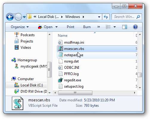Luego mueva el msescan.vbs archivo de script en el directorio de Windows.