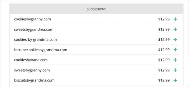 Aquí, buscamos el dominio "cookiesbygrandma.com", que fue tomado. Hover sugirió automáticamente una lista de dominios lo suficientemente similar a nuestro término de búsqueda que podríamos estar bien con ellos. Si no está seguro de qué dominio desea exactamente, intente buscar en Hover.