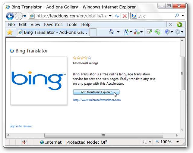 Una vez que haya hecho clic en Agregar a Internet Explorer y confirmó que la instalación de su nuevo acelerador está lista para usar.