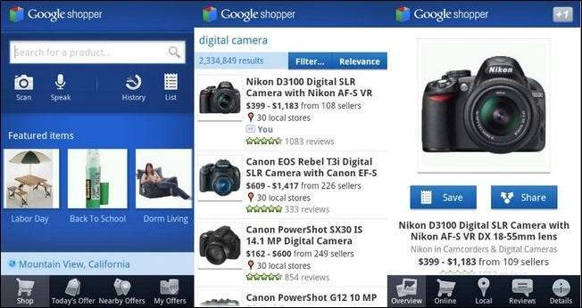 Google Shopper se conecta directamente al enorme motor de comparación de precios de Google. Puede buscar mediante ingreso de texto, escaneo de código de barras o ingreso de voz. También incluye cupones y descuentos que reconocen la ubicación (si opta por la publicidad voluntaria en nombre de ahorrar dinero).