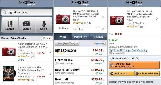 El escáner de código de barras era funcional pero bastante lento en comparación con el escáner rápido como un rayo en Google Shopper. Al igual que la función estrella de Google, Amazon tiene el sistema de lista de deseos, por lo que puede guardar elementos fácilmente para revisarlos más tarde (se podría argumentar fácilmente que el sistema de lista de deseos de Amazon es superior porque puede compartirlo fácilmente con otros). Además del escáner de código de barras, también puede pronunciar su consulta de búsqueda y escribirla (encontramos que la función de voz es tan borrosa en esta aplicación como en Google Shopper, no es de extrañar ver cómo está utilizando la misma funcionalidad subyacente proporcionada Por el teléfono). Price Check también tiene una función de búsqueda por teléfono. Toma una foto de un libro, dvd, juego u otro medio con una portada, y puedes buscarlo en Amazon. Es como una versión muy limitada de Google Goggles (curiosamente, no existe una función equivalente en Google Shopper).
