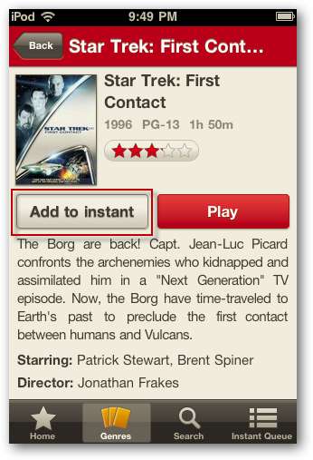 Cuando encuentre una película que le guste, puede agregarla fácilmente a su Cola instantánea tocando el Agregar a Instant botón.