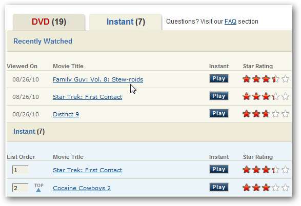 Aquí puede ver que movimos Star Trek: Primer contacto a la parte superior de su Cola instantánea.