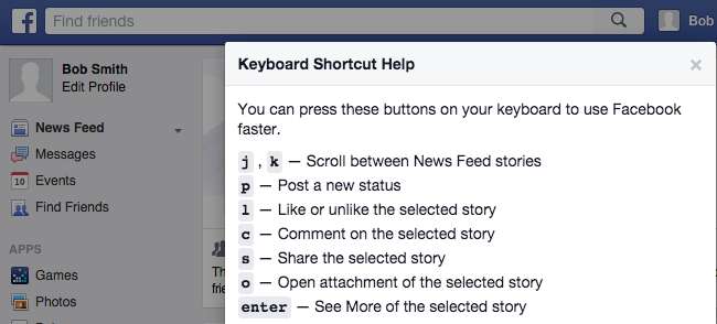 Facebook usa el j y a claves para alternar entre historias de noticias. Utilizar el pags , l , c , s , o y Entrar teclas para realizar operaciones en la publicación seleccionada, de modo que pueda moverse rápidamente entre las noticias, dar me gusta, comentar y hacer todo lo demás con solo su teclado.
