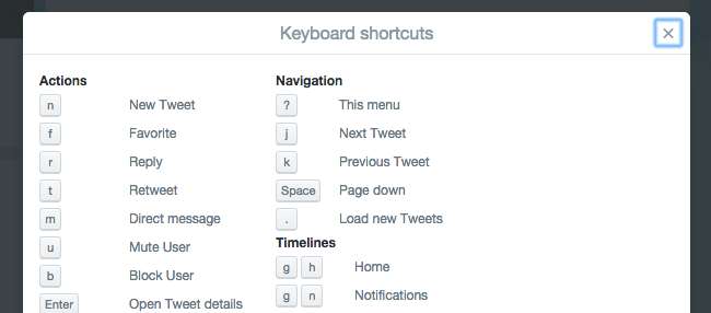 Twitter ofrece muchos atajos similares. Use j y k para seleccionar tweets y moverse a través de ellos, y use teclas como f, r y t para realizar acciones en esos tweets seleccionados. Grifo norte y comience a escribir para dejar un tweet propio y use otras combinaciones de teclas para moverse entre las diferentes páginas del sitio web de Twitter.