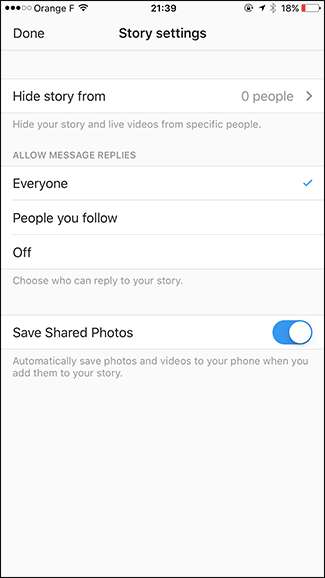 Toque el icono de engranaje en la parte superior izquierda para ir a la pantalla de configuración. Aquí puede bloquear a las personas para que no vean su historia y establecer quién puede responder con mensajes.