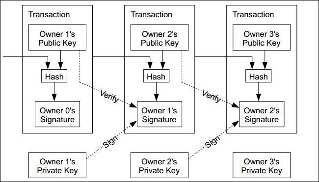 Todas las personas del sistema pueden verlo, pero su identidad y la identidad del vendedor son solo firmas temporales, pequeños elementos de los enormes problemas matemáticos que forman el corazón de la criptografía digital. Estos valores se conectan a la ecuación de la cadena de bloques, y el problema en sí es "resuelto" por los miembros de la red peer-to-peer generando hashes de criptografía.