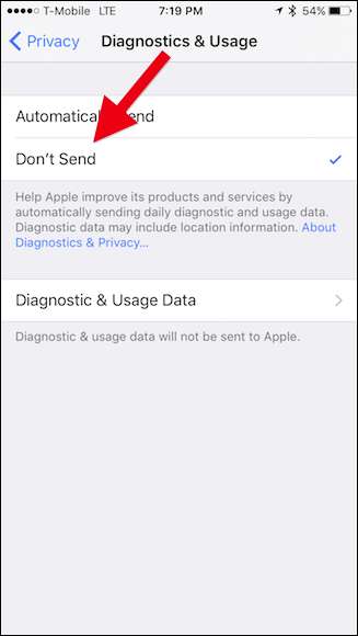 Por último, en la pantalla Diagnóstico y uso, toque "No enviar".