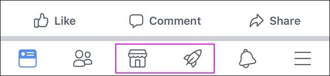 Recientemente, aparecieron dos nuevos íconos en la aplicación de Facebook en iOS donde solía estar el ícono de chat anterior: un pequeño escaparate y un cohete. La pequeña tienda es un enlace rápido a Facebook Marketplace, y el cohete es un enlace a la sección Explorar de Facebook.
