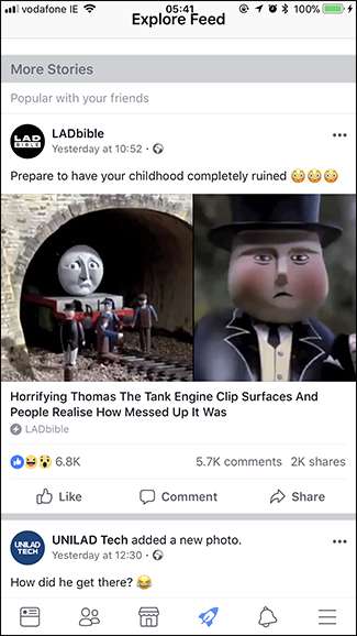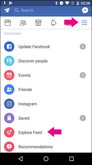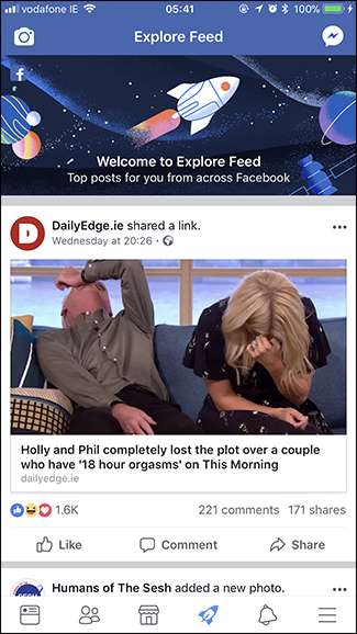 Resultó que el Feed de exploración tampoco es tan nuevo como pensaba. En realidad, ha estado en la aplicación móvil por un tiempo, pero está escondido en un menú. Para muchos usuarios, todavía estará allí. Vivo en Irlanda y a menudo se nos utiliza como campo de prueba para las funciones antes de que se implementen en todo el mundo. Fuimos uno de los primeros países en obtener Reacciones a las publicaciones de Facebook . Sin embargo, si lo veo en la aplicación de iOS, es probable que todos los demás comiencen a verlo en unos meses.