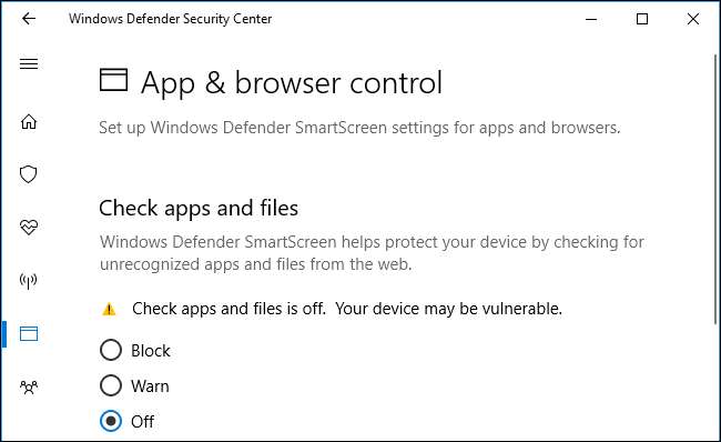 Si tu quieres deshabilitar el filtro SmartScreen , diríjase al Centro de seguridad de Windows Defender> Control de aplicaciones y navegador, y luego configure "Verificar aplicaciones y archivos" en "Desactivado" en Windows 10.