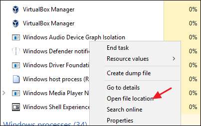 “Windows Audio Device Graph Isolation” en sí mismo es un componente oficial de Windows y muy probablemente no sea un virus. Si bien no hemos visto informes de ningún virus que haya secuestrado este proceso, siempre es posible que veamos uno en el futuro. Si desea estar seguro, puede consultar la ubicación del archivo subyacente del proceso. En el Administrador de tareas, haga clic con el botón derecho en "Aislamiento de gráficos de dispositivos de audio de Windows" y elija la opción "Abrir ubicación de archivo".