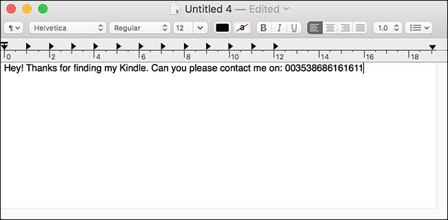 Cree un archivo de Word o texto con su nombre y sus datos de contacto. Siga las instrucciones de este artículo. para enviar el archivo a su Kindle. Si su Kindle tiene 3G, se entregará instantáneamente. De lo contrario, se entregará si alguna vez se conecta a Wifi.