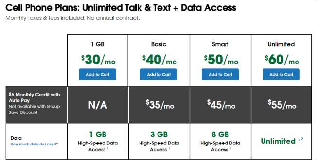 Cricket tiene fácilmente la estructura de precios más familiar, y cada línea adicional ofrece un ahorro más significativo que la anterior. Si es un solo usuario, también puede ahorrar $ 5 al mes habilitando el pago automático; desafortunadamente, esto no funciona con el descuento grupal.